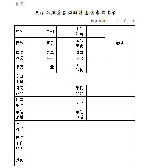 ? ? ? ? 1.《天柱山風(fēng)景區(qū)講解員志愿者報(bào)名表》(見(jiàn)附件);