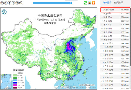 受“杜蘇芮”殘留云系影響,安徽天柱山昨天夜間開始出現(xiàn)猛烈降雨,29日08時-30日08時的24小時降水量達330毫米,達特大暴雨級別,是過去24小時里全國降雨最強的國家站,也是該站點自1949年來單日降水量第一。