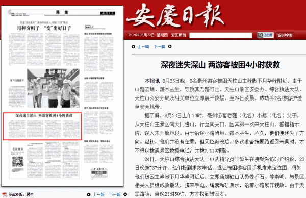 24日,天柱山綜合執(zhí)法大隊一中隊指導員王淼生在接受采訪時介紹說,23日晚8時37分許,他們接到求救電話,遂讓被困游客用手機發(fā)來定位圖,得知他們被困主峰腳下月華峰附近后,立即通知駐山隊員姜喬石、陳崇明,與景區(qū)相關人員組成救援隊,攜帶手電、繩索和礦泉水,沿著小路展開搜救。由于天黑路險,當晚23時30許,方才找到被困者。
